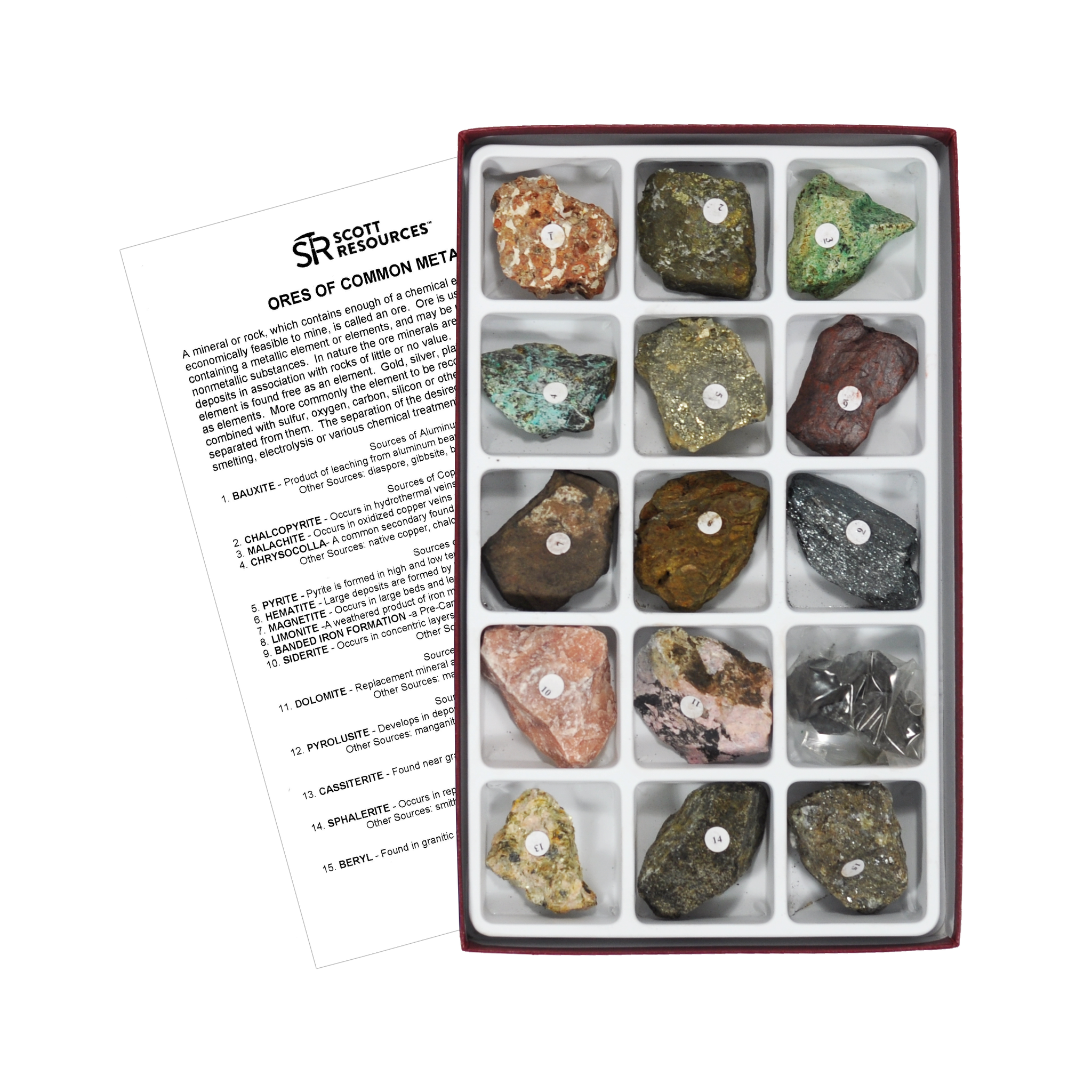 The term “ore” is used in connection with a rock or mineral mass when it contains enough of an element or compound to make it economically feasible to mine. 15 specimens of the more important ores are included. Grades 6-12.Geology is a required STEM subject.