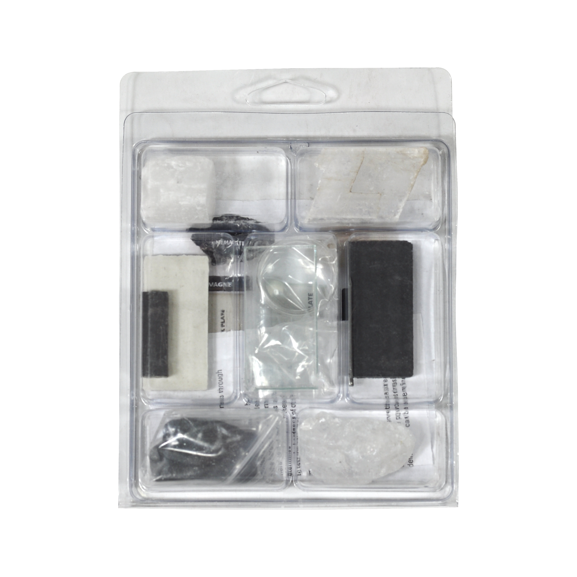 This mineral test kit introduces kids to the scientific method of identifying minerals through scratch tests. Contains the basic tools needed to test and identify 4 included specimens and minerals you collect. This can be a great science fair project! Includes black and white streak plates (for color test), glass plate (for hardness test), nail, magnet, pocket magnifier, user's guide, and four minerals: hematite, quartz, calcite, and gypsum. Ages 8+, Grades 3+. Geology is a required STEM subject.